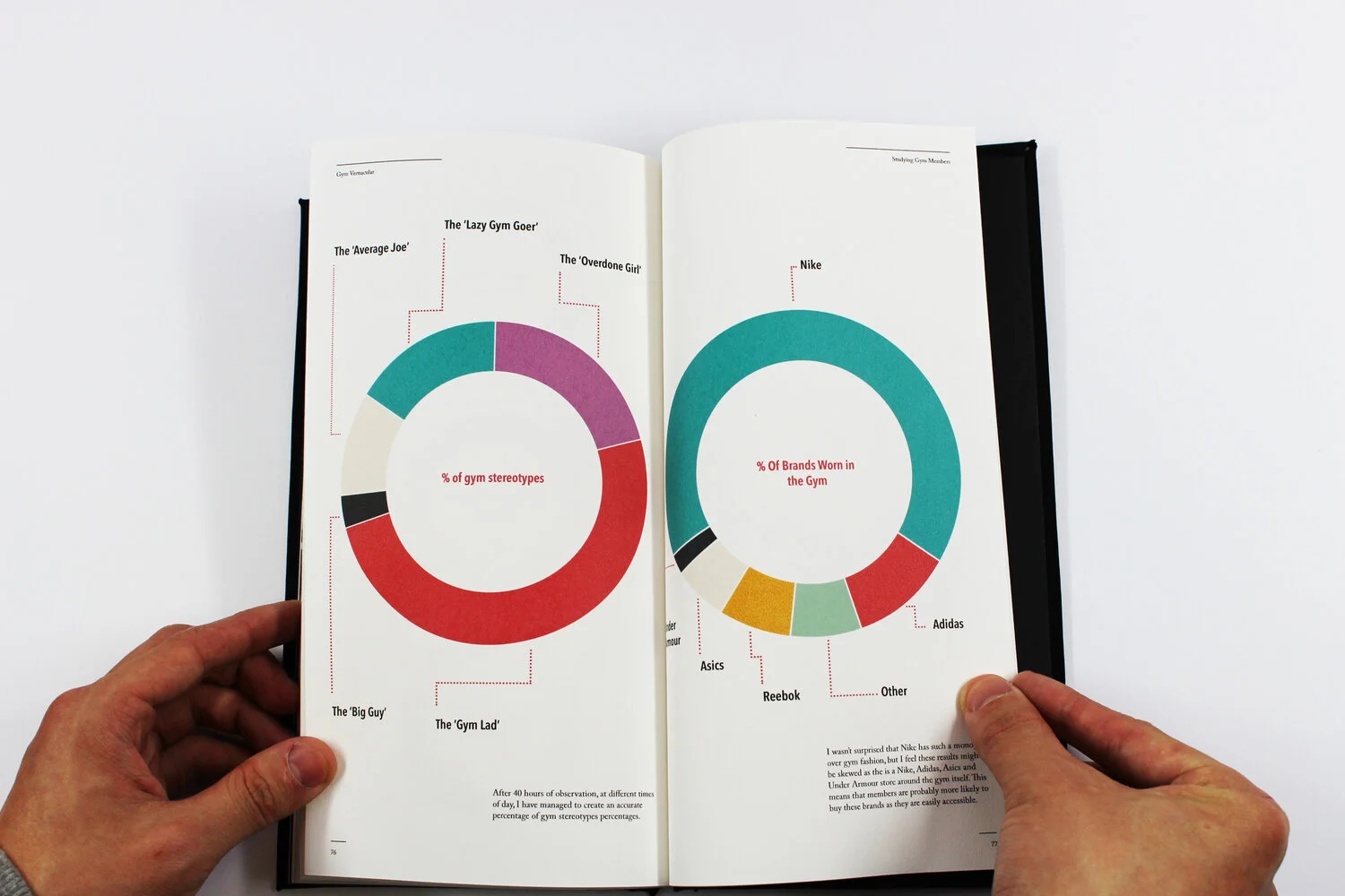 As an avid gym goer, I wanted to highlight some of these categories. The book itself explores historical context of the gym, steroid use, gym stereotypes, fad diets and it also features infographics about gym usage. The different age ranges, their average time in the gym and even what the most popular clothing brand are. The information for these were collected over a period of 40 hours.