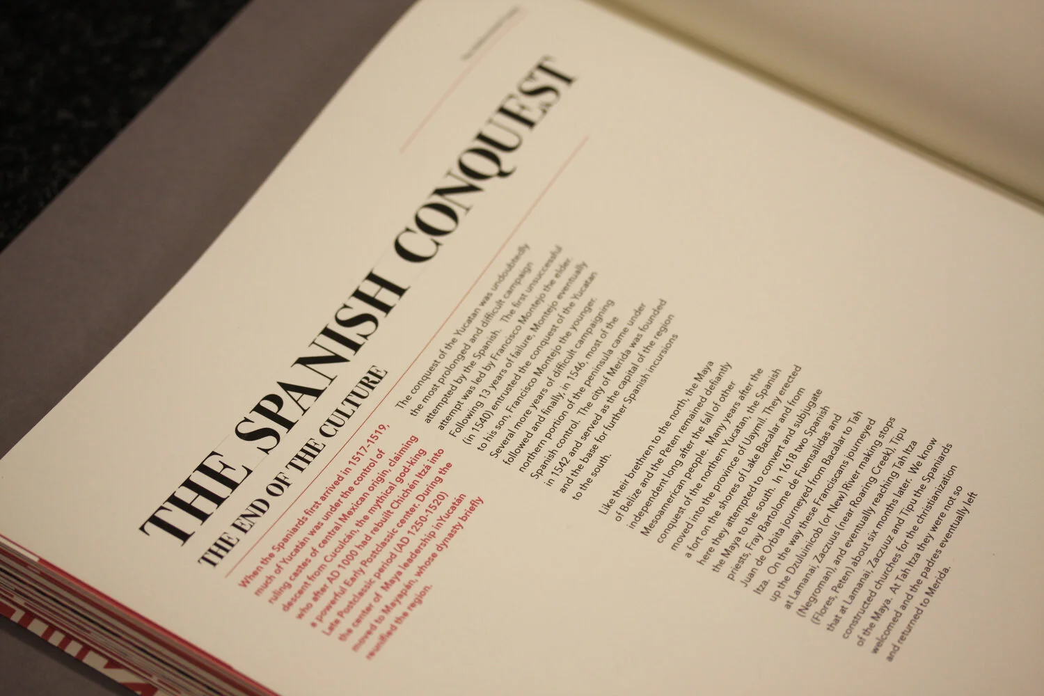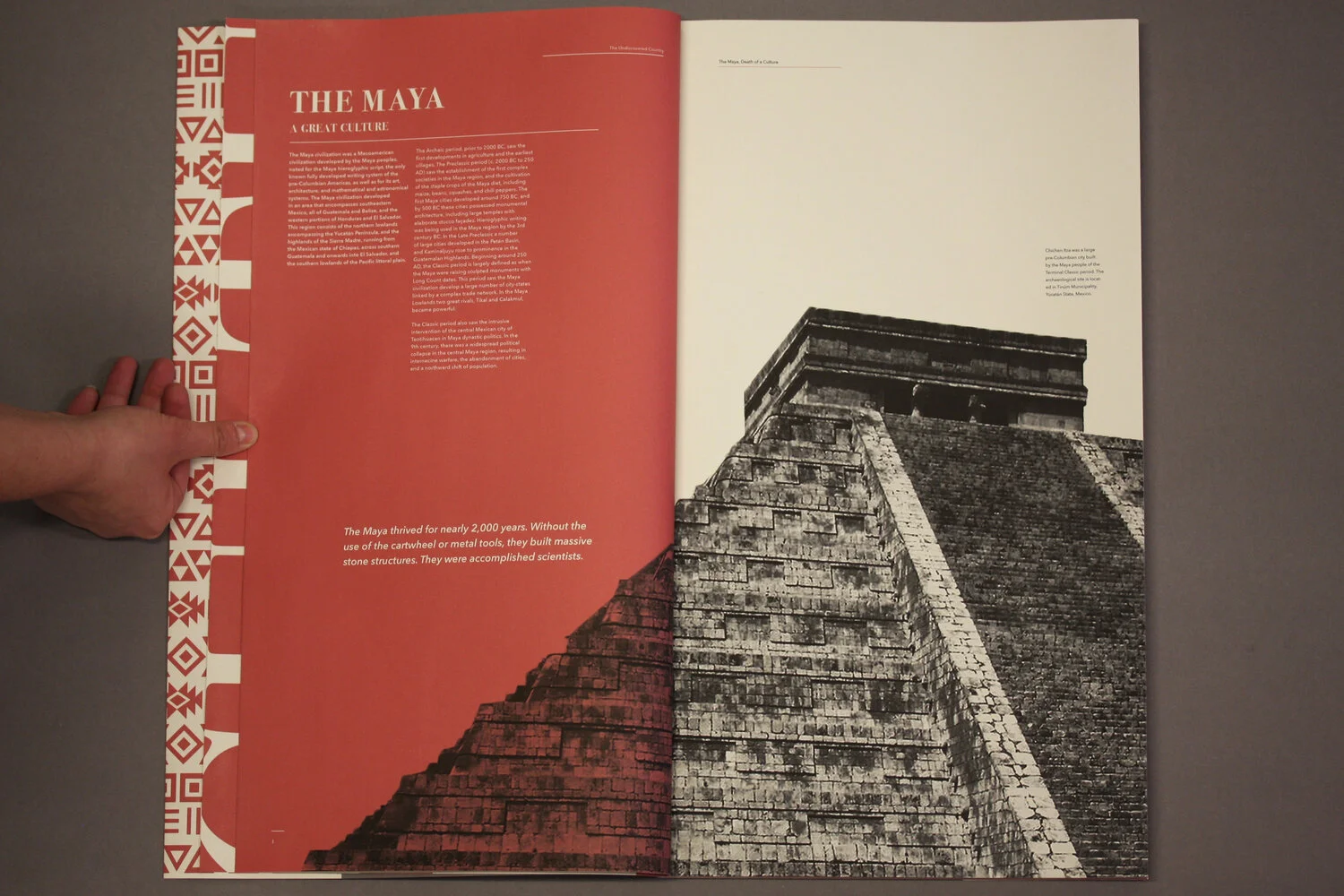 The design of the book is set to mirror the content. The large format of the book was to reflect the size of the structures the Maya built. I felt that these temples needed to be shown at this size, as it helps reinforce how impressive they were. The only colour was red to not only backup the message of death, but also it was a very popular colour used within Mesoamerican cultures.